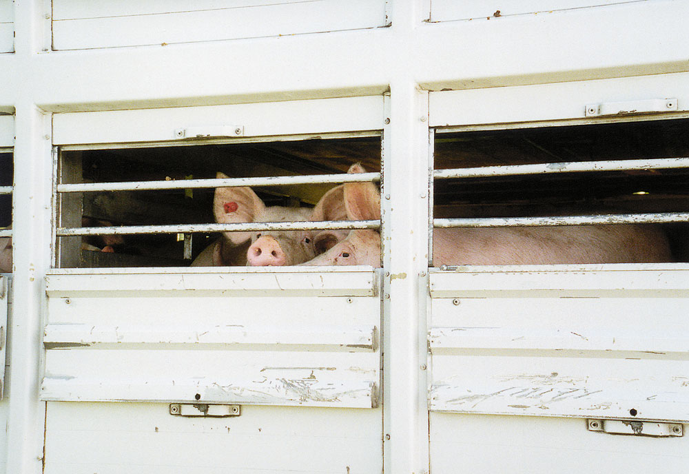 Die Schweine suchen stets die Sicht ins Freie. Die spätsommerlichen Temperaturen sind angenehm warm. Viele Monate haben die Tiere in dunklen Spaltenboden-Ställen gelebt, Tag und Nacht. Seit langer Zeit kommen sie erstmals wieder an die frische Luft. Es ist das letze Mal. |