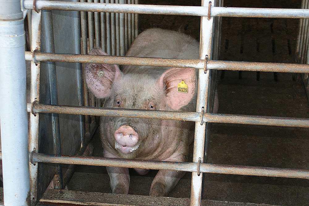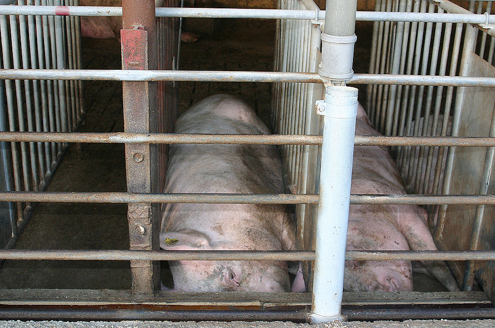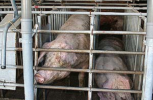 Innerhalb dieser Anlage sind die Schweine dazu gezwungen, direkt an und über ihren eigenen Ausscheidungen zu leben und daneben zu schlafen und zu essen. Dies zählt eindeutig zu den abnormalen Verhaltensweisen dieser intelligenten und sozial lebenden Tiere. Die Behandlung durch den Menschen überlässt den Schweinen jedoch keine andere Wahl. |