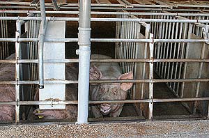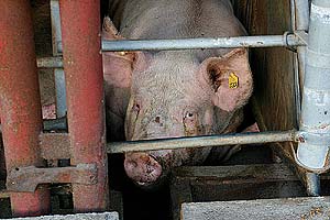 Die Tiere verhalten sich im Gegensatz zu ihren nächsten Verwandten, den frei lebenden Wildschweinen, besonders apathisch, gedämpft und depressiv. Das lässt sich einzig und alleine auf die einschränkende Haltung zurückführen, denn Hausschweine sind frei lebend zu den gleichen (sozialen) Verhaltensweisen wie die heutigen Wildschweine fähig. |