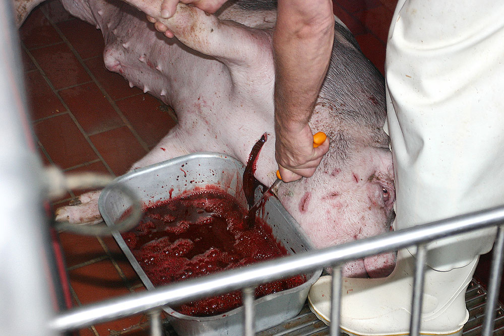 Das Foto verdeutlicht, wie der Behälter unterhalb der zugefügten Verletzung zunehmend mit dem heraustretenden Blut des Tieres gefüllt wird. Da das Tier lediglich betäubt ist, transportiert das noch schlagende Herz das Blut solange durch die offene Wunde nach außen, bis der Herzmuskel sowie andere lebenswichtige Körperfunktionen des Tieres versagen, was schließlich zum eintretenden Tod des Lebewesens führt. |