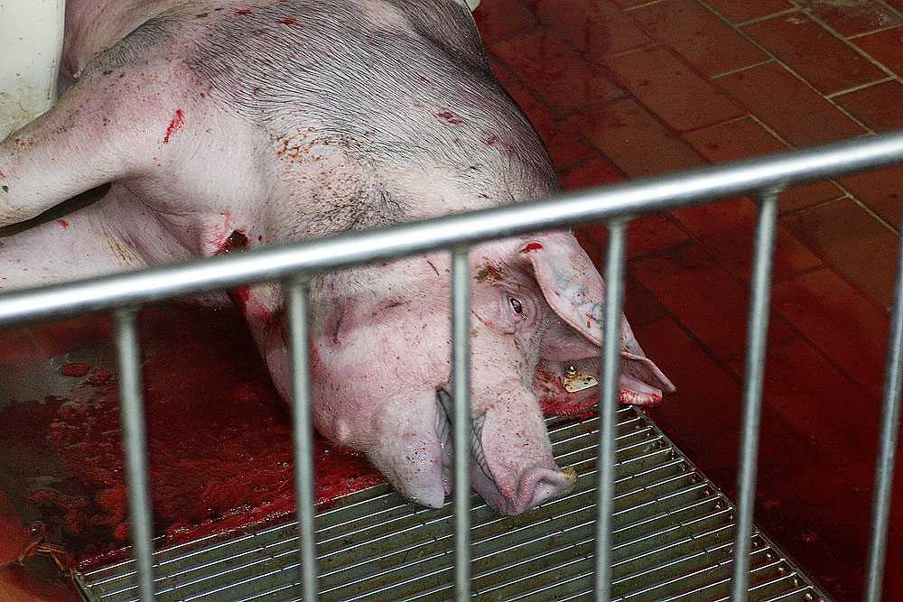 Ein Schwein liegt inmitten der eigenen Blutlache unter dem aufgehängten Schwein. Ein weiteres, noch lebendes Schwein bewegt sich zögernd durch den eingegrenzten Tötungsbereich. |