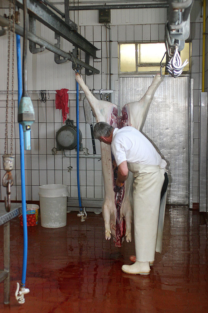 Dies ist die Situation: lebende Schweine, tote Schweine, sterbende Schweine, ein abgegrenzter und blutverschmierter und sogar teilweise mit Kot befleckter Bereich. Menschen die ihre Arbeit verrichten. Nach der Organentnahme und der Zerlegung der toten Tiere werden diese zu und und in einer Theke in einem Metzgereigeschäft an Konsumenten verkauft, die darauf achten, dass sie "frisch beim Metzger vor Ort" kaufen anstatt im Supermarkt. |