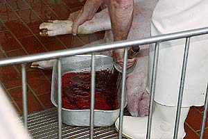 Entscheidend ist folgendes: die Tiere werden eingehend nur betäubt. Die Elektro-Betäubung führt nicht zum eintretenden Tod des Tieres. Die Betäubung ist lediglich die Vorraussetzung für das weitere Verfahren. Der Tod des Tieres tritt erst durch die sogenannte "Entblutung" ein. Zu diesem Zweck wird eine Verletzung an der Hauptschlagader mutwillig herbeigeführt. Dieser Vorgang ist im nächsten Bild zu sehen. |