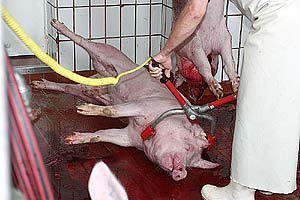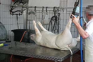 Das nebenstehende Foto zeigt, wie ein Schwein für die Schlachtung betäubt wird. Dazu werden dem Schwein Elektroden an den Kopf gesetzt. Durch das Anlegen einer Betäubungszange wird durch elektrische Spannung ein Strom erzeugt, der eine kurzfristige Betäubung des Tieres bewirkt. In größeren Schlachthäusern wird dieser Vorgang auch maschinell durchgeführt. Andernfalls werden Schweine vor der Schlachtung mit Kohlendioxid begast. |