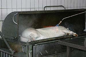 Die Schweine werden nach dem Blutentzug in eine Maschine befördert, in der ihr Borstenfell durch die Behandlung mit heißem Wasser entfernt wird. |