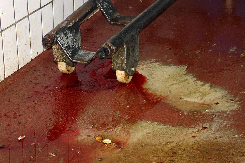 Blut tritt aus der offenen Wunde heraus. Das Tier ist lediglich betäubt. Der Tod tritt durch Verblutung ein. |