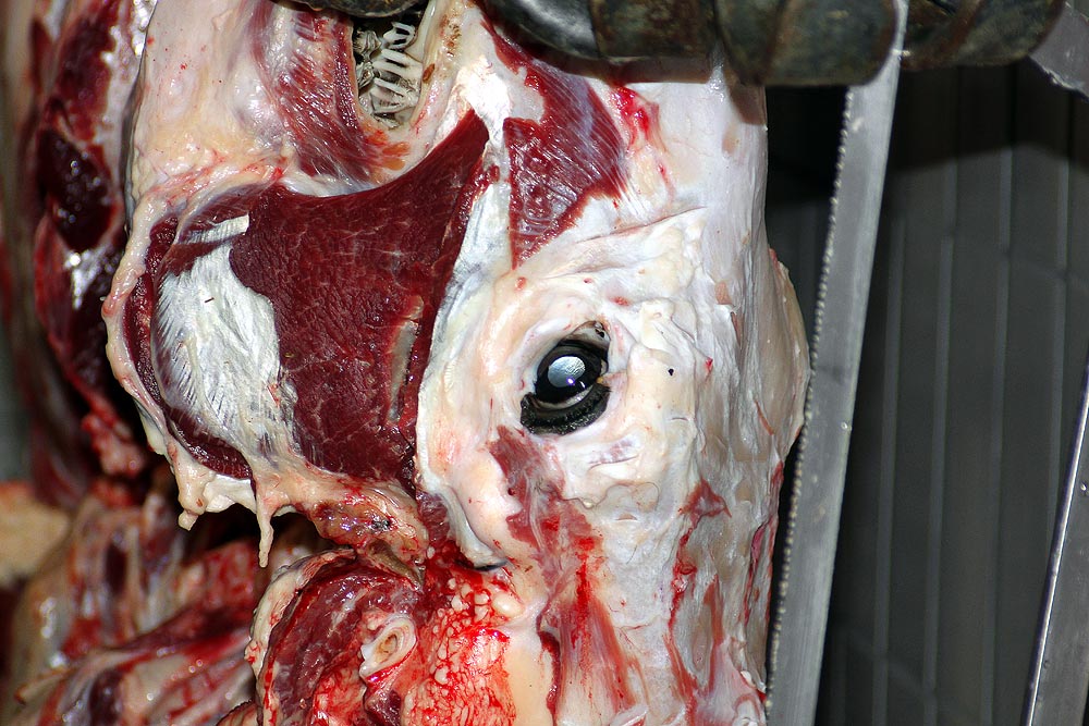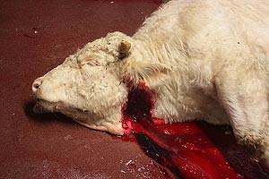 Der Schlachter setzt das Messer an die Kehle des Tieres, sticht zu - der sogenannte "Entblutungsschnitt". |